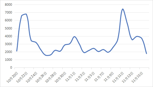 在10月20日至11月16日共计28天监测期内,共收集到“消费维权”相关信息20,176,208条,日均约72万条。10月20日、11月1日、11月11日节点前后时段波动明显,11月10日达到峰值,为1,630,034条。